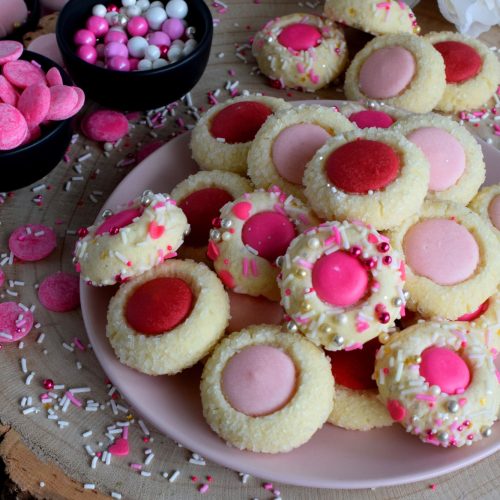 Similar to a classic thumbprint cookie, these valentine cookies use candy melts instead of jam. Makes a great valentine treat for that special someone!