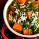 Lastly, reduce the heat to a simmer and add the chopped parsley and cooked rice. Stir into the broth and vegetable mixture.