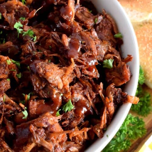 Add one cup of your favourite bbq sauce and stir into the pork. Continue to cook until sauce is heated through.