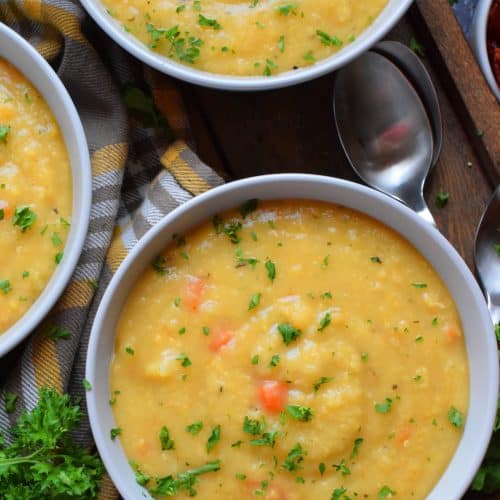 Vegetarian Split Pea Soup is every bit as delicious, wholesome, and nostalgic as the soup your mom made. This is a pantry staple recipe with a few fresh root vegetables. Not looking for vegetarian soup? Add bacon or ham to your soup or serve them both on the side!