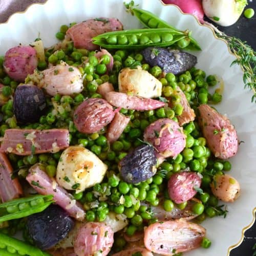 If you thought you didn't care much for radishes, you were wrong! This deliciously simple and rustic Warm Radish and Pea Salad will certainly change your mind! Radishes mellow and sweeten when roasted, and when tossed with fresh green peas in butter, honey, and herbs, the result is absolute perfection!