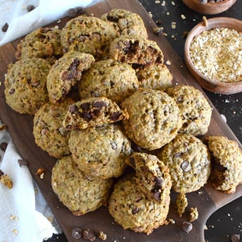 These deliciously soft and chewy cookies are baked with healthy amount of shredded zucchini and rolled oats. Flavoured with pumpkin spice and sweetened with milk chocolate chips, these cookies also have crunch factor with toasted chopped walnuts!